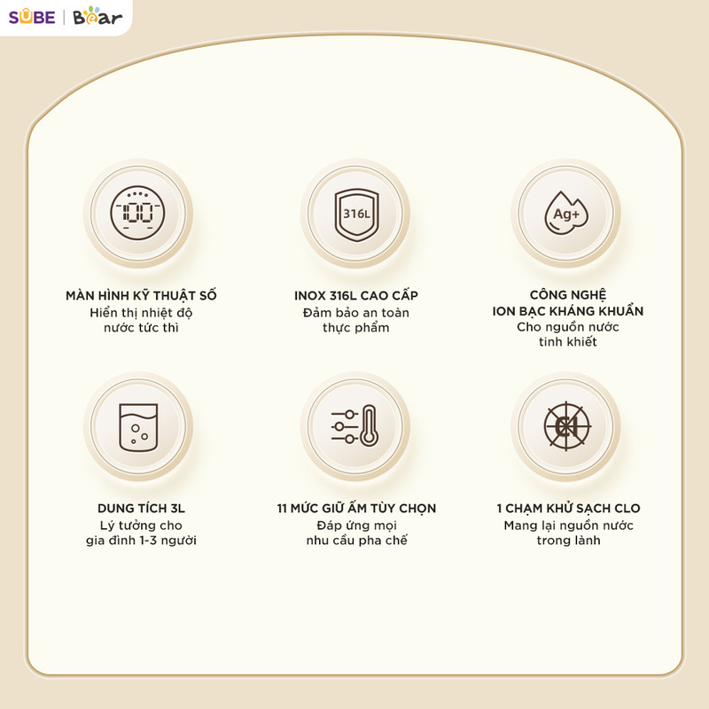 Bình thuỷ điện Bear 3L EWB-5H30C60 không chỉ đun sôi nước, mà còn làm sạch nước! Nhờ công nghệ khử Clo, sản phẩm này loại bỏ các chất gây ô nhiễm và mùi khó chịu, mang đến nguồn nước an toàn hơn cho sức khỏe. Nước sau khi đun sẽ không còn mùi Clo khó chịu, giúp thưởng thức đồ uống ngon hơn.