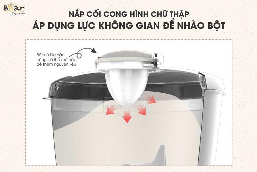 Thiết kế nắp cối cong hình chữ thập, giúp bạn có thể dùng lực ép khối bột xuống vô cùng đơn giản. Bất cứ lúc nào bạn cũng có thể mở nắp cối ra để thêm nguyên liệu nếu muốn. Khi nhào bột bằng máy Bear, khối bột sẽ được xoay lật theo nhiều chiều nhờ lưỡi dao đa góc đa tầng.