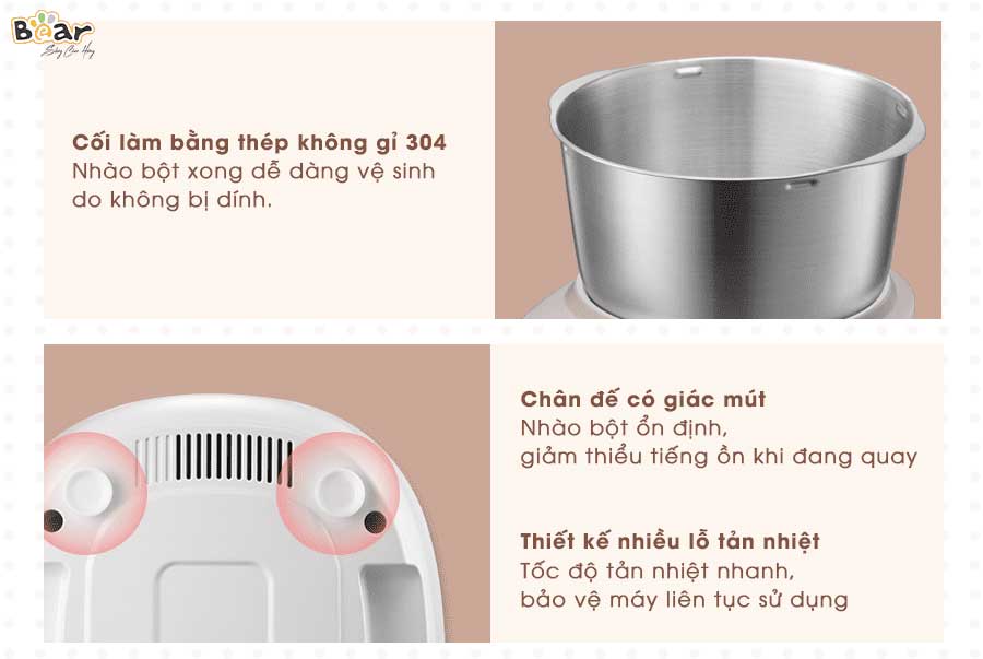 Lưỡi dao và cối trộn bột đều được làm từ chất liệu thép không gỉ 304, giúp bạn dễ dàng vệ sinh và làm sạch sau khi sử dụng. Ngoài ra, chân đế của máy trộn bột Bear 5L còn có giác mút, nhằm giảm thiểu tiếng ồn khi máy đang hoạt động. Thiết kế lỗ tản nhiệt dưới đế máy, giúp gia tăng tốc độ tản nhiệt bảo vệ máy khỏi sự quá tải.
