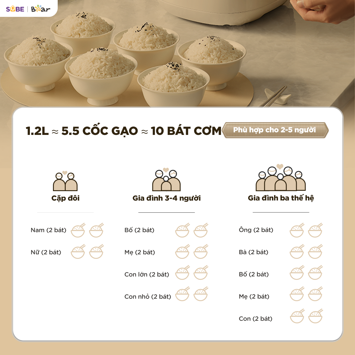 Với dung tích 1.2L, Nồi cơm điện Bear 1.2L có thể nấu được khoảng 6-8 bát cơm, phù hợp cho sinh viên, hoặc gia đình 3-4 người.