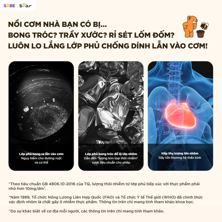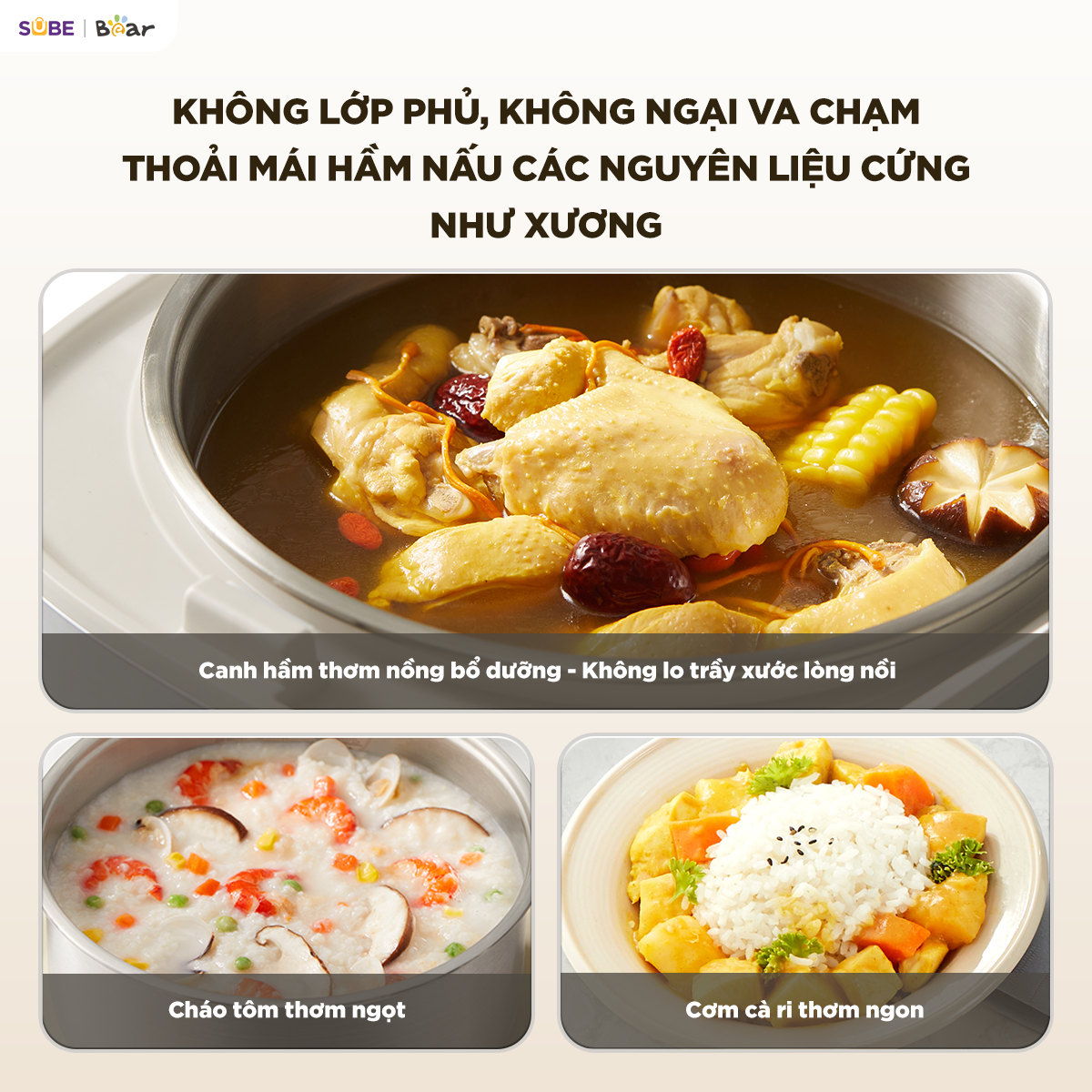 Lòng Nồi cơm điện Bear 1.2L được làm hoàn toàn bằng Inox 316L – chất liệu cao cấp thường được dùng trong ngành y tế. Không có lớp phủ chống dính, nồi loại bỏ hoàn toàn nguy cơ bong tróc hay giải phóng hóa chất độc hại khi nấu ở nhiệt độ cao. Inox 316L có khả năng chống ăn mòn, chịu nhiệt và truyền nhiệt tốt, giúp cơm chín đều, dẻo, thơm ngon. Chất liệu inox giúp dễ dàng vệ sinh, bạn có thể dùng búi sắt hoặc máy rửa bát cũng không lo nồi bị bong tróc.