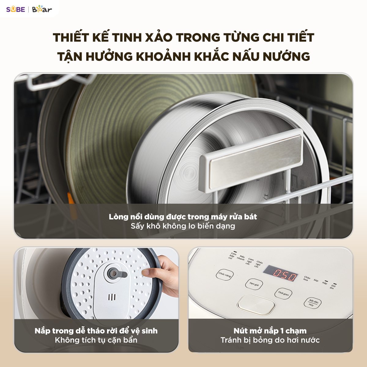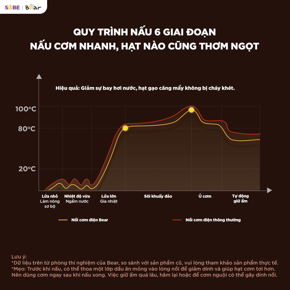 Nồi cơm điện Bear 1.2L ứng dụng công nghệ nấu 6 bước thông minh, mô phỏng quy trình nấu bằng bếp củi truyền thống gồm: lửa nhỏ, lửa vừa, lửa lớn, sôi bùng, ủ và giữ ấm. Nhờ quy trình này, hạt gạo được làm chín từ từ, giữ trọn vị ngọt và cấu trúc dẻo, mềm. Cơm không bị khô hay nhão, mà luôn căng mọng và thơm ngon như nấu bằng nồi gang truyền thống.