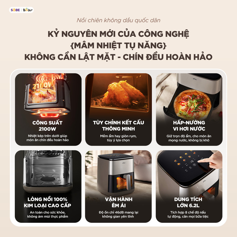 Nồi chiên không dầu Bear 6.2L AF-5H20J75 đang là sản phẩm gây sốt trên thị trường bởi sự tiện lợi và chất lượng mà nó mang lại. Một sản phẩm giúp chế biến món ăn một cách đa dạng, giảm thiểu sử dụng dầu mỡ, tránh nguy cơ mắc các bệnh về tim mạch nhưng vẫn đảm bảo chất lượng của món ăn. Hãy cùng Bear khám phá chi tiết hơn về sản phẩm này nhé!